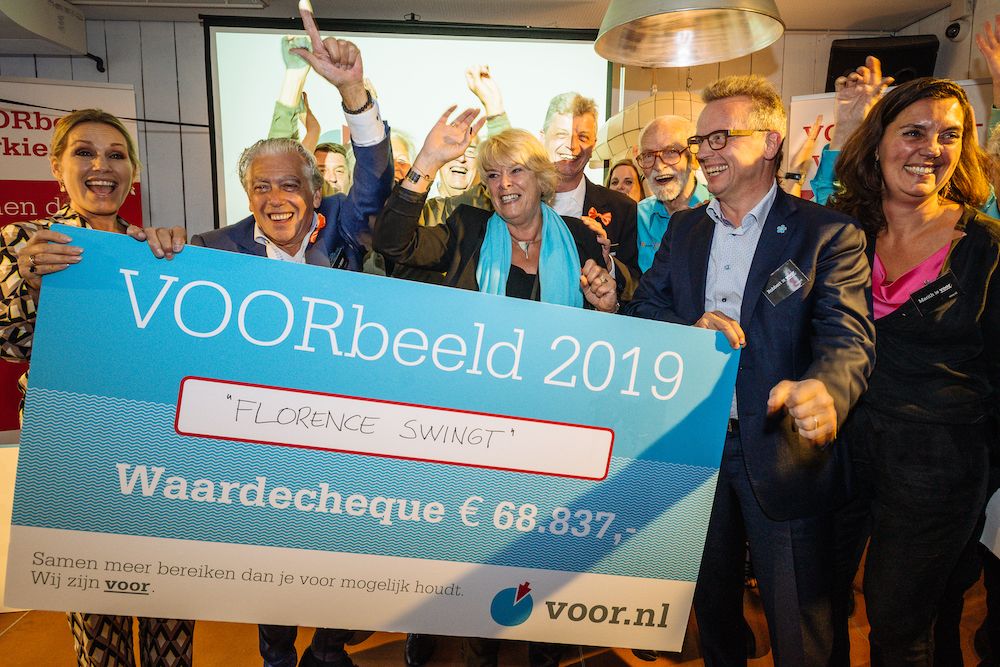 ‘We hadden in de finale twee geduchte concurrenten, beide ook mooie maatschappelijke projecten, maar dat de jury uiteindelijk koos voor het project ‘Florence Swingt’ is natuurlijk geweldig. De volgende ochtend beseften we pas wat er was gebeurd. We hebben echt gewonnen, een heleboel geld. En ook kwam het gevoel: nu moeten we echt aan de bak’, beschrijft Martin Oosterheert, verantwoordelijk voor Florence Actief, de euforie na het winnen van de VOORbeeld-verkiezing 2019. Zij overtuigden de jury met hun pitch die nog een verrassing bevatte voor het publiek. ‘Achterin de zaal hadden we een van onze bands stiekem achter een gordijn klaargezet. Opeens ging het gordijn open en begon de band te spelen. Je zag de zaal kijken: wat gebeurt daar nou?’