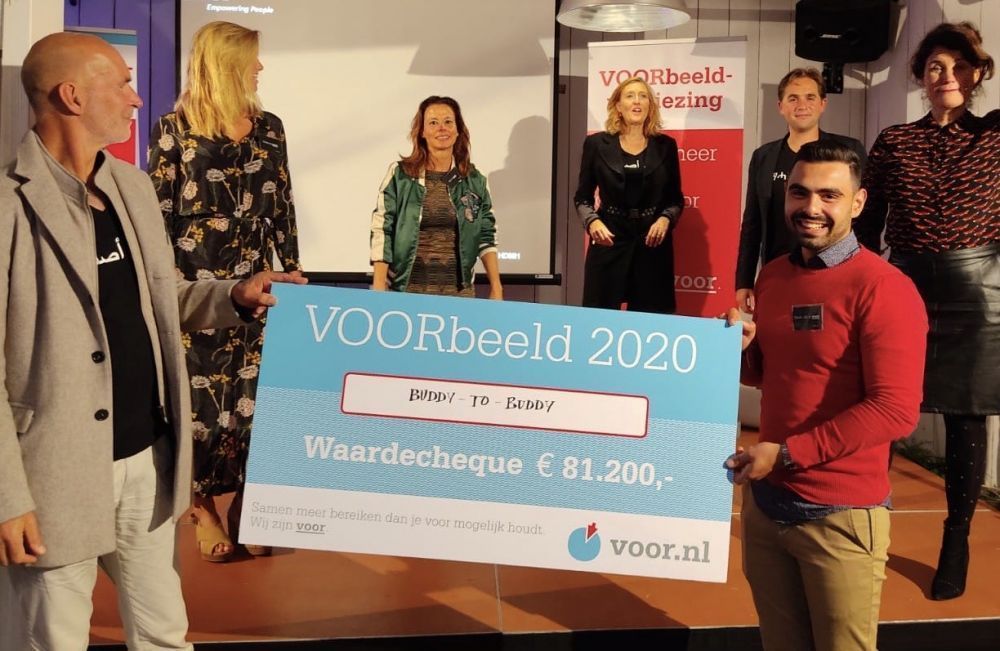 Buddy to Buddy won de zevende editie van de VOORbeeld-verkiezing. Zij ontvingen € 81.400 (bijna driekwart van het beschikbare bedrag in 2020) als ondersteuning om hun ambities te realiseren. Omdat het ‘…mensen uit hun bubbel haalt en gelijkwaardigheid creëert’, aldus Tanja Jess namens de vijfkoppige jury van de VOORbeeld-verkiezing. Zij doelde op het belangrijke uitgangspunt van Buddy to Buddy dat mensen iets voor elkaar kunnen betekenen, van elkaar kunnen leren en elkaars wereld vergroten.